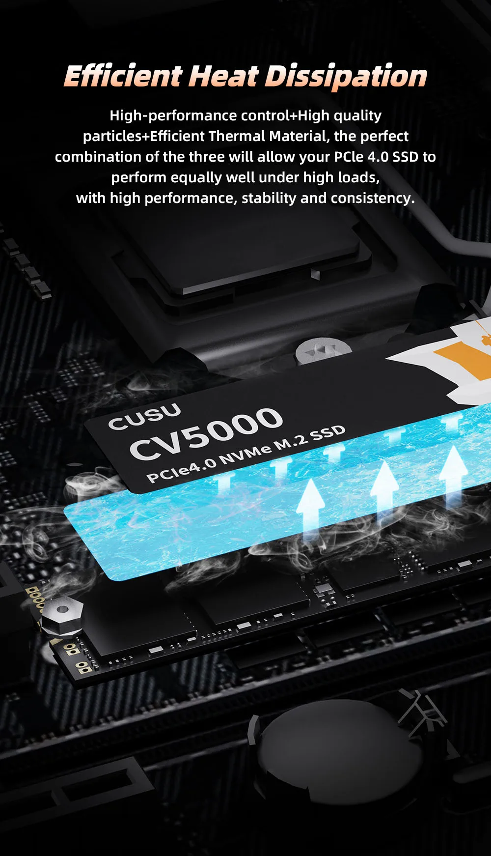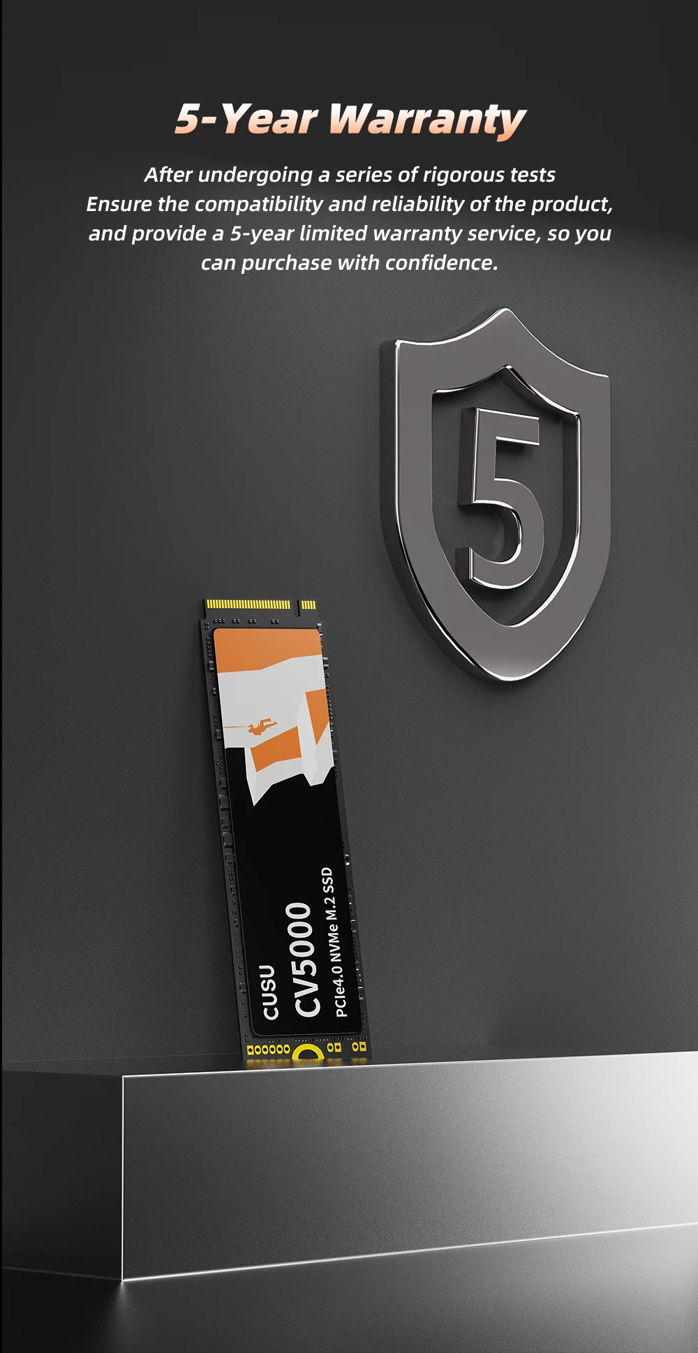 La velocidad no sirve de nada sin estabilidad. Por eso, el CUSU M2 SSD NVMe está diseñado para trabajar de forma estable y segura incluso bajo cargas intensas. Sus chips de calidad premium reducen la generación de calor y garantizan una vida útil prolongada.
