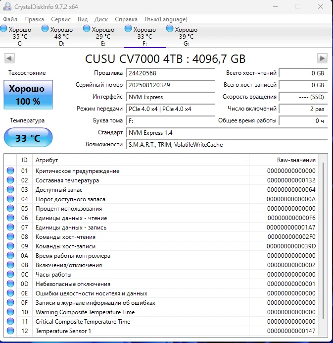El SSD M2 NVMe CUSU CV7000 de 4TB es completamente satisfactorio. La temperatura durante la carga no superó los 52 grados con el disipador incluido de la placa base. La prueba se realizó en una plataforma Intel. ¡Asegúrate de instalar un disipador en la unidad!
