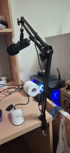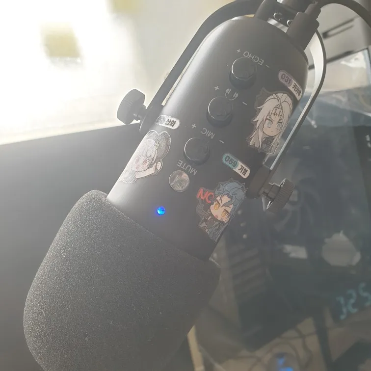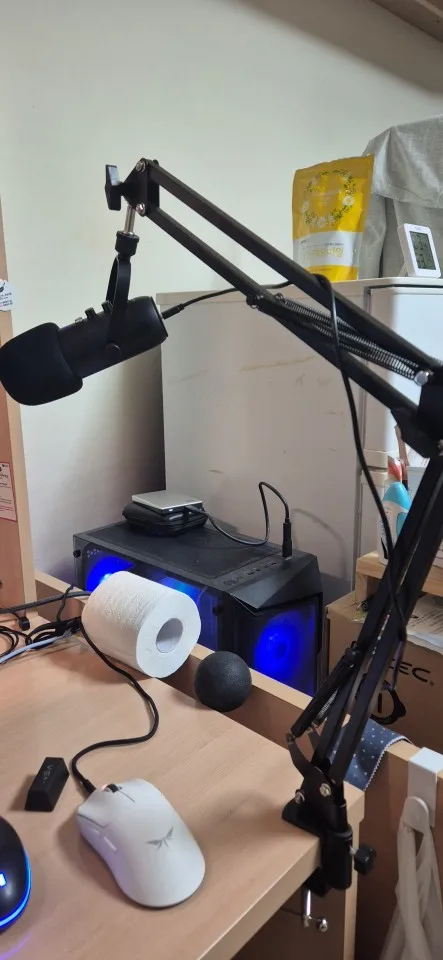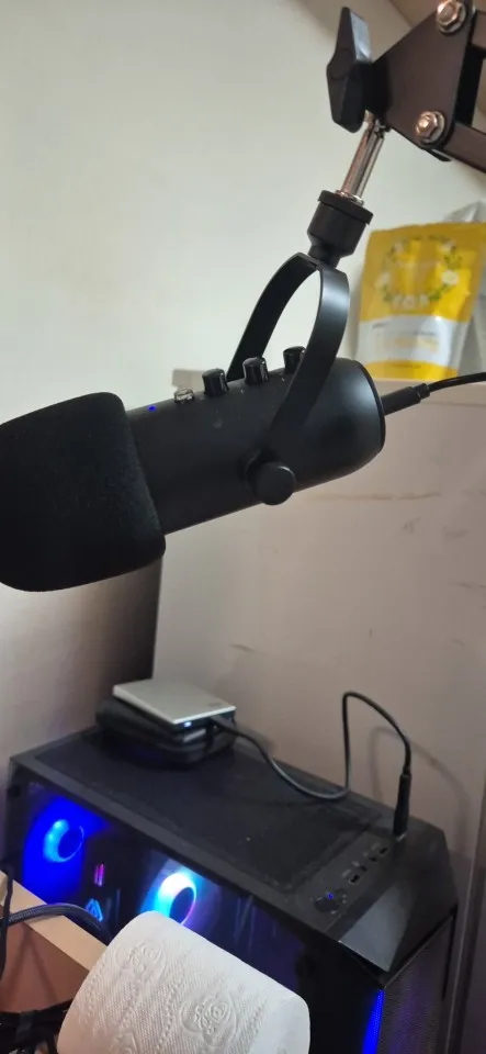 Es increíble que un micrófono y un brazo se puedan ofrecer por menos de 20.000 wones. Es un producto rentable. El brazo del micrófono es decente y el rendimiento del micrófono es bastante bueno. La calidad del sonido está a la altura de productos que cuestan entre 30.000 y 40.000 wones. Prácticamente no hay fenómeno de clipping, incluso cuando se habla en alto, y capta el sonido muy bien. No hay ruido desagradable, pero es un inconveniente porque capta sonidos de lejos. Usar RTX Voice soluciona el problema. La conexión es USB-C a tipo A y viene con un micrófono que tiene ajuste de preamplificador de encendido/apagado y un jack de 3.5 mm para monitoreo. También puedes ajustar el volumen de monitoreo. Tiene un precio de alrededor de 10,000 wones e incluso soporta su propia función de eco. Es perfecto para principiantes.