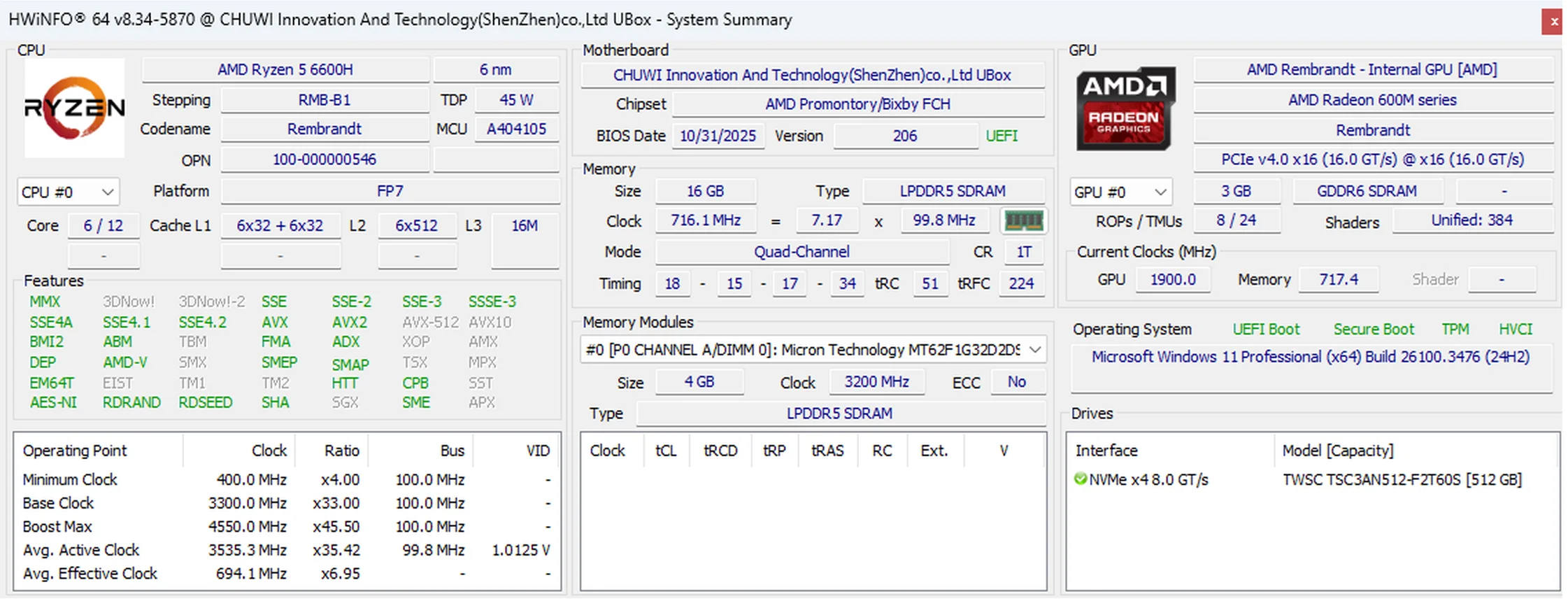 Mini PC CHUWI UBox Ryzen 5 6600H 16GB 512GB 4K 144Hz